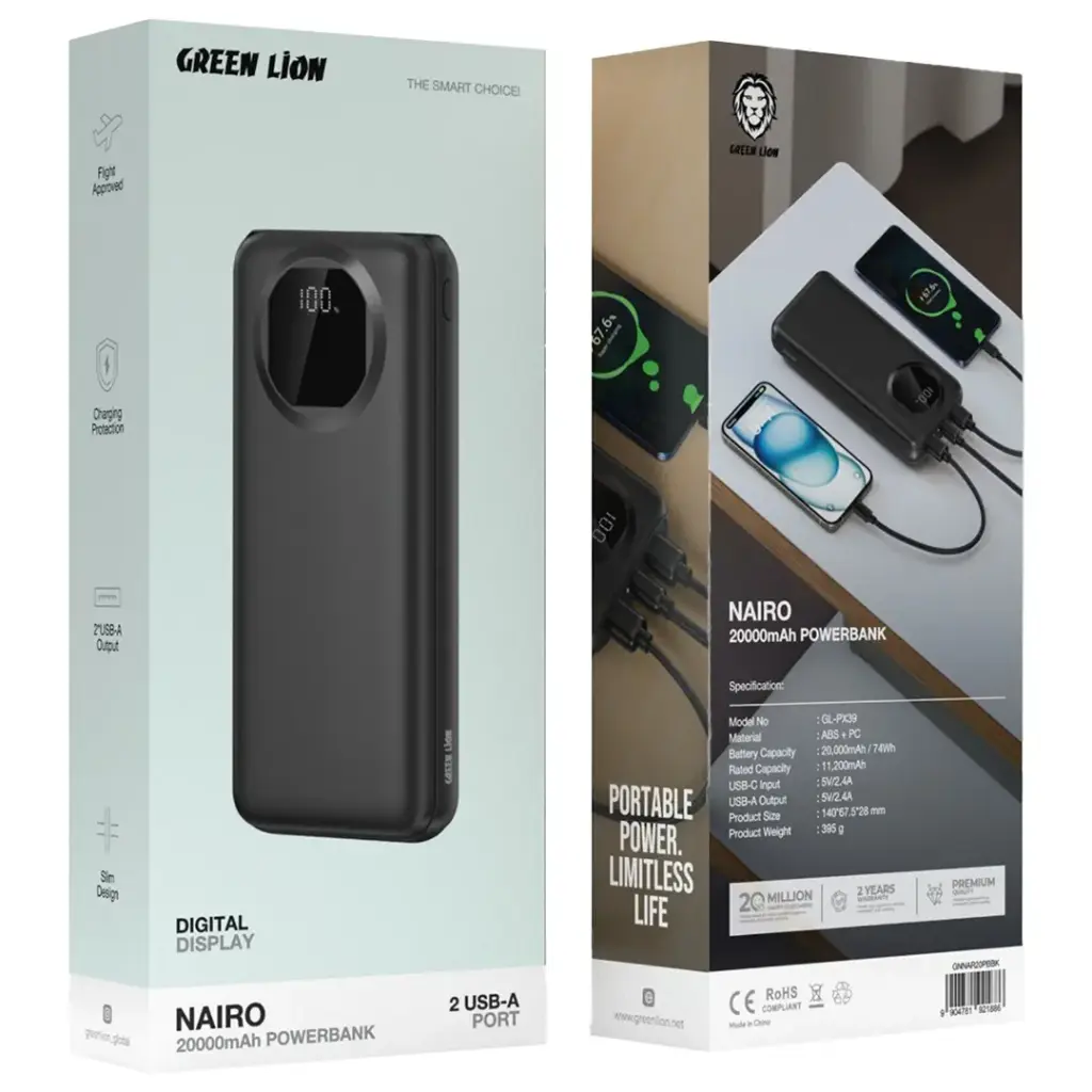 پاوربانک Green Lion Nairo 20000mAh یک راهکار شارژ قدرتمند و بسیار جمع و جور است که برای شارژ دستگاههای شما در تمام طول روز طراحی شده است. به عبارت دیگر، با ظرفیت باتری عظیم 20000 میلیآمپر ساعت (74 وات ساعت) و ظرفیت اسمی 11200 میلیآمپر ساعت، همچنان باید قدرت کافی برای شارژ تلفنهای هوشمند، تبلتها و سایر دستگاههای خود داشته باشید. دو خروجی USB-A با ولتاژ 5 ولت/2.4 آمپر، شارژ کارآمد شما را تضمین میکنند، در حالی که ورودی شارژ سریع USB-C آن، سیستم شارژ سریع را فراهم میکند. این پاوربانک که با طراحی شیک خود، مکمل جیب شماست، دارای یک صفحه نمایش دیجیتال نیز میباشد که نمای واضحی از میزان شارژ باقی مانده باتری را ارائه میدهد. این پاوربانک برای پروازها تأیید شده است؛ یک همراه قابل اعتماد در سفرها. این پاوربانک با محافظت در برابر شارژ، از خود و دستگاههای شما محافظت میکند. ایدهآل برای کسانی که به برق قابل اعتماد و قابل حمل برای استفاده روزمره یا مسافرتی نیاز دارند.