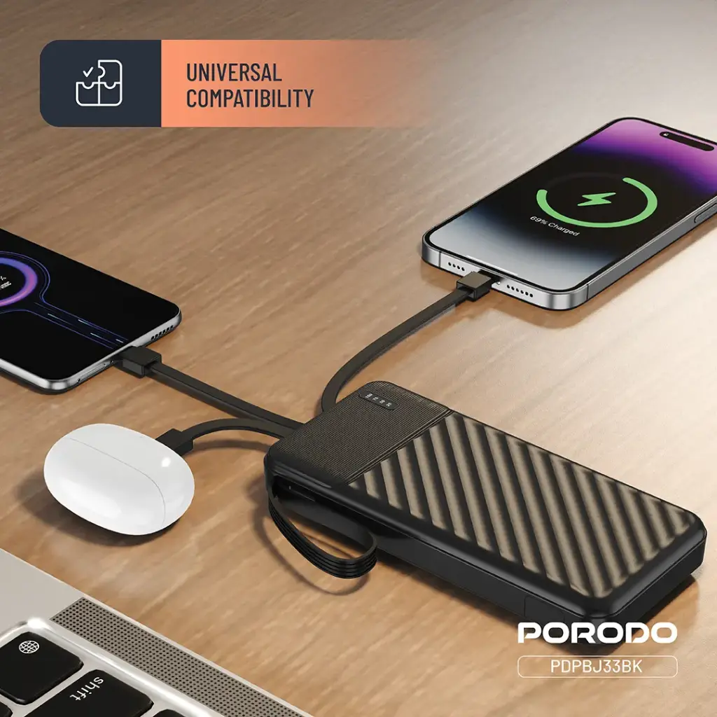 پاوربانک Porodo با کابلهای یکپارچه - مشکی، یک دستگاه 10000 میلیآمپر ساعتی، منبع تغذیهای عالی است که میتواند یک دستگاه تلفن همراه را صرف نظر از اینکه کاربر در حال حرکت است یا قرار است ساعتها در مکانی بماند، شارژ کند. این پاوربانک با طراحی بسیار مدرن، اندازه کوچک و ظرفیت عالی خود تضمین میکند که در هنگام سفر، کار یا صرفاً بیرون بودن، با کمبود شارژ مواجه نخواهید شد. کابلهای داخلی Micro، Type-C و Lightning به این معنی است که دیگر نیازی به سیمهای اضافی نخواهید داشت. میتوانید از شارژ سریع با خروجی 5 ولت/2.1 آمپر برای همه کابلها استفاده کنید که باعث میشود تحویل برق دستگاهها بسیار سریع انجام شود. مکانیسم ایمنی یکپارچه در دستگاه اجازه نمیدهد که دستگاههای شما دچار شارژ بیش از حد، دمای بالا یا قطعی جریان شوند. بنابراین، تمام محافظتها ارائه میشود. علاوه بر این، دستگاه دارای یک پایه تلفن همراه داخلی است، بنابراین با استفاده بدون هندزفری، همیشه میتوانید تلفن خود را در سطح چشم خود داشته باشید. علاوه بر این، عملکرد چراغ قوه در مواقع اضطراری شما را نجات میدهد و دسته قابل حمل به شما امکان میدهد آن را به راحتی هر کجا که میروید ببرید. ترکیب عالی کوچک بودن، قدرتمند بودن و چندکاره بودن، پاوربانک Porodo Piano را به یک ضرورت برای هر فرد فعالی تبدیل کرده است.