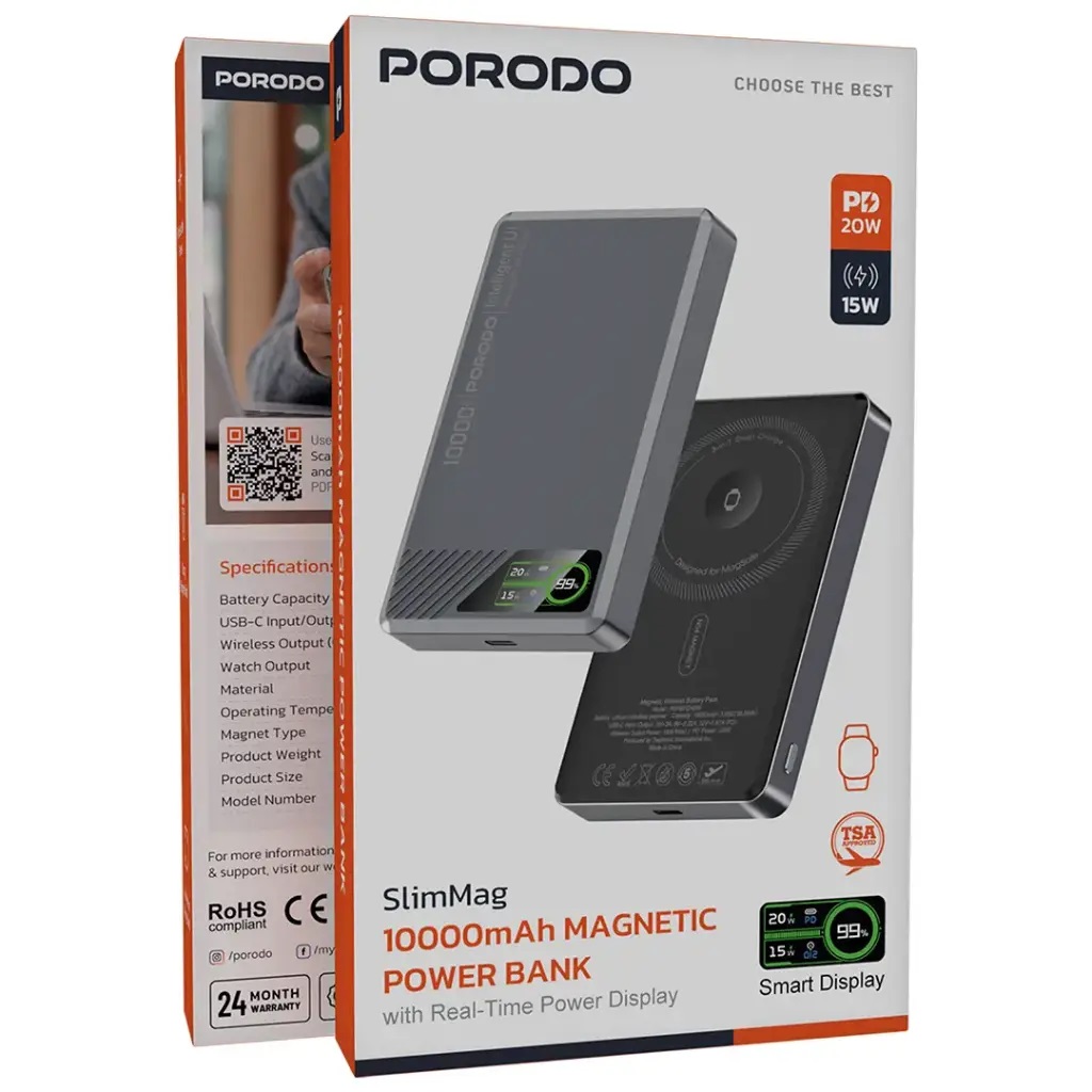 پاوربانک مغناطیسی Porodo SlimMag 5000mAh یک قطعه فناوری خیرهکننده است که شارژ فوقالعاده باریک و کارآمد را همراه با طراحی زیبا ارائه میدهد. این پاوربانک که تنها 10 میلیمتر ضخامت دارد، به راحتی در جیب شما قرار میگیرد و از ویژگی شارژ مغناطیسی خود که اتصال محکمی را با دستگاههای سازگار تضمین میکند، بهرهمند میشود. به لطف شارژ سریع 20W PD و پشتیبانی از شارژ بیسیم 15W، این پاوربانک در شارژ تلفنها، تبلتها و سایر دستگاهها بسیار سریع است. صفحه نمایش LED هوشمند، میزان باتری را در لحظه نشان میدهد، بنابراین شما همیشه از وضعیت شارژ آگاه هستید. این پاوربانک برای MagSafe بسیار خوب طراحی شده است و از این رو میتواند برای شارژ بسیار سریع و پایدار، بسیار ایمن به دستگاههای شما متصل شود. این پاوربانک دارای ظرفیت باتری عظیم 5000mAh است که قطعاً میتواند چندین بار شارژ را در خود جای دهد و خروجی ساعت امکان شارژ بسیار آسان ساعتهای هوشمند را فراهم میکند. پاوربانک مغناطیسی Porodo SlimMag 5000mAh، صرف نظر از اینکه برای شارژ در حین حمل و نقل یا در خانه استفاده شود، ارائه دهنده عملکرد قوی و قابل اعتماد است. مشخصات