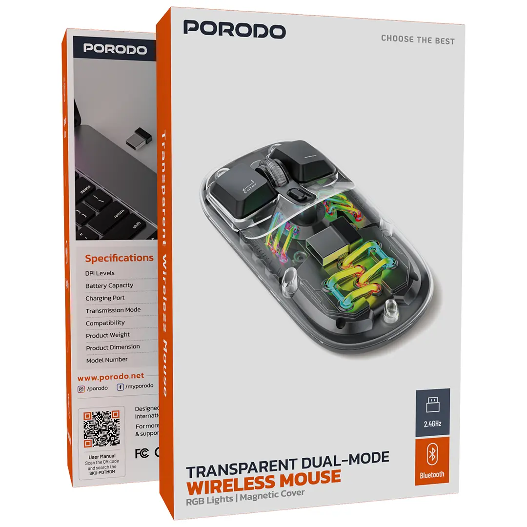 شرکت Porodo ماوس بیسیم دو حالته شفاف را ارائه میدهد، دستگاهی عالی برای به حداکثر رساندن زیبایی و راحتی لپتاپ یا کامپیوتر شما. این ماوس دارای ظرفیت باتری ۴۰۰ میلیآمپر ساعت، نور RGB و DPI قابل تنظیم (۸۰۰، ۱۲۰۰، ۱۶۰۰) است. میتوانید به سادگی از طریق بلوتوث یا حالت بیسیم متصل شوید و آن را از طریق پورت Type-C شارژ کنید. علاوه بر این، با ویندوز، مک، اندروید و iOS سازگار است.